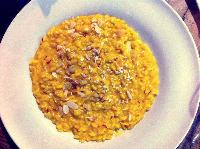 Calice di Trebbiano d’Abruzzo, dell’Agricola Cirelli, entrée, frittelle e mega cotoletta alla milanese con mandorle e arancia, al modico (per Milano lo è eccome!) prezzo di 25€.