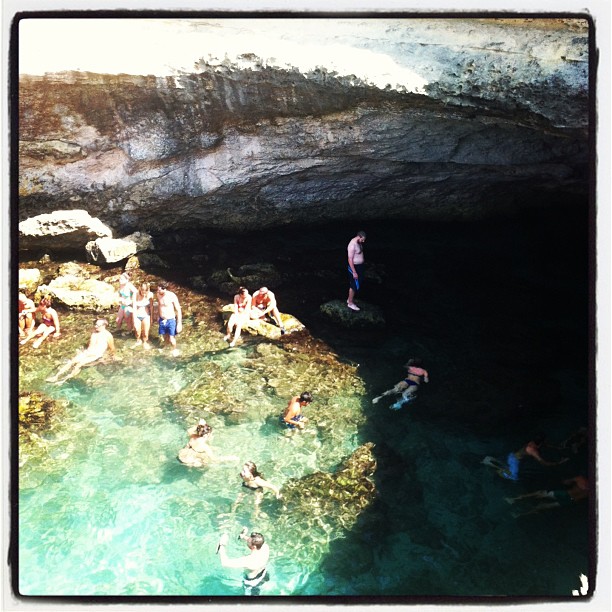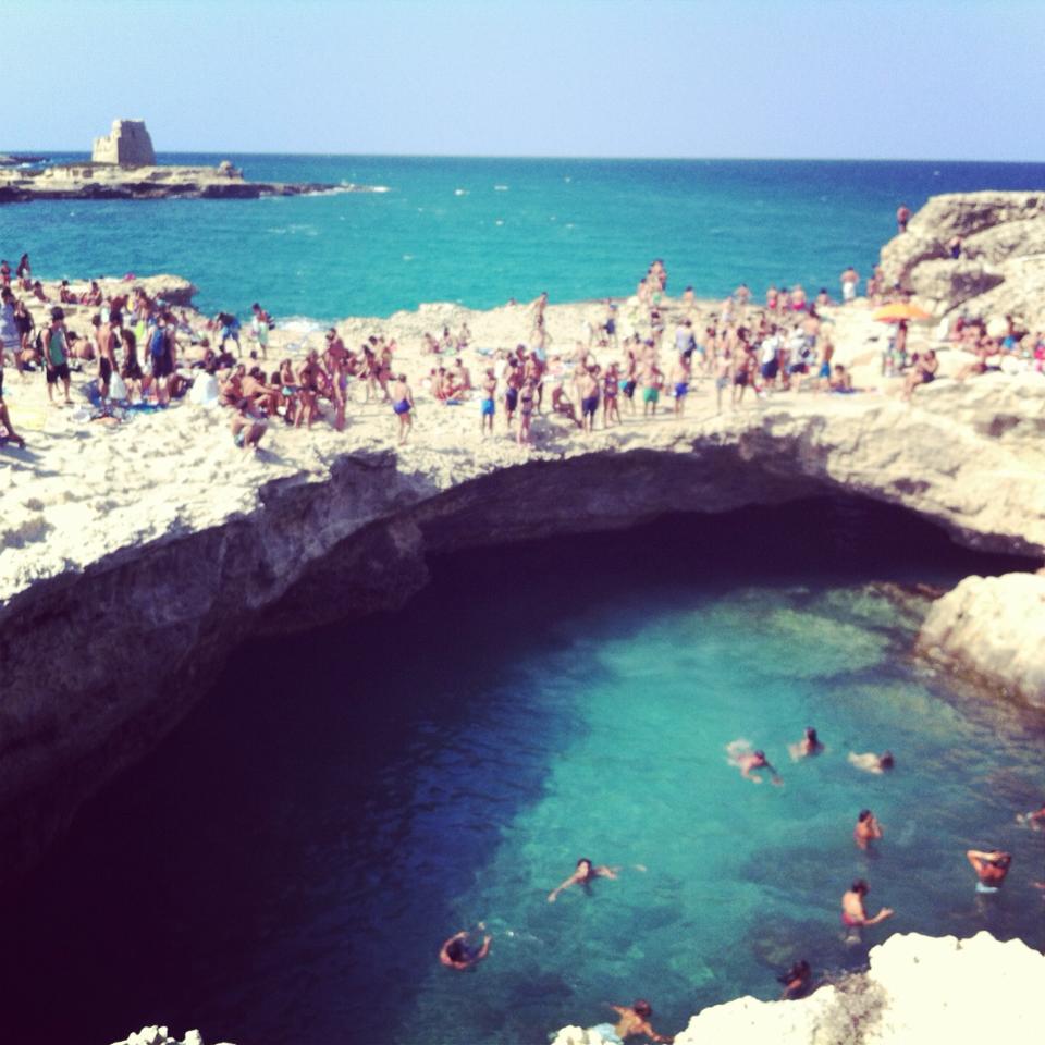 Se siete già stati in Puglia sicuramente vi sarà capitato di andare a La Poesia, caletta rocciosa dal mare mozzafiato, che offre alcuni dei “tuffi più tuffi” che si possono fare in Salento! Mentre eravamo a La Poesia ci è anche capitata un’esplorazione dalla E maiuscola: infatti proseguendo alla destra della piscina naturale, che vedete sotto in foto, aguzzando bene la vista vedrete uno spiraglio di luce. Proprio lì, si trova un passaggio che vi condurrà in un’affascinante e misteriosa grotta, che in passato si pensava fosse il santuario di una divinità indigena, chiamata Taotor (come appare più volte scritto sulle sue pareti). Per arrivarvi è necessario nuotare in apnea per qualche secondo e avere una torcia o qualcosa di simile con voi! Se non ne avete una non vi preoccupate, perché con molta probabilità potrete aggregarvi a qualcuno più attrezzato in procinto di fare la stessa esplorazione, come è capitato a noi!