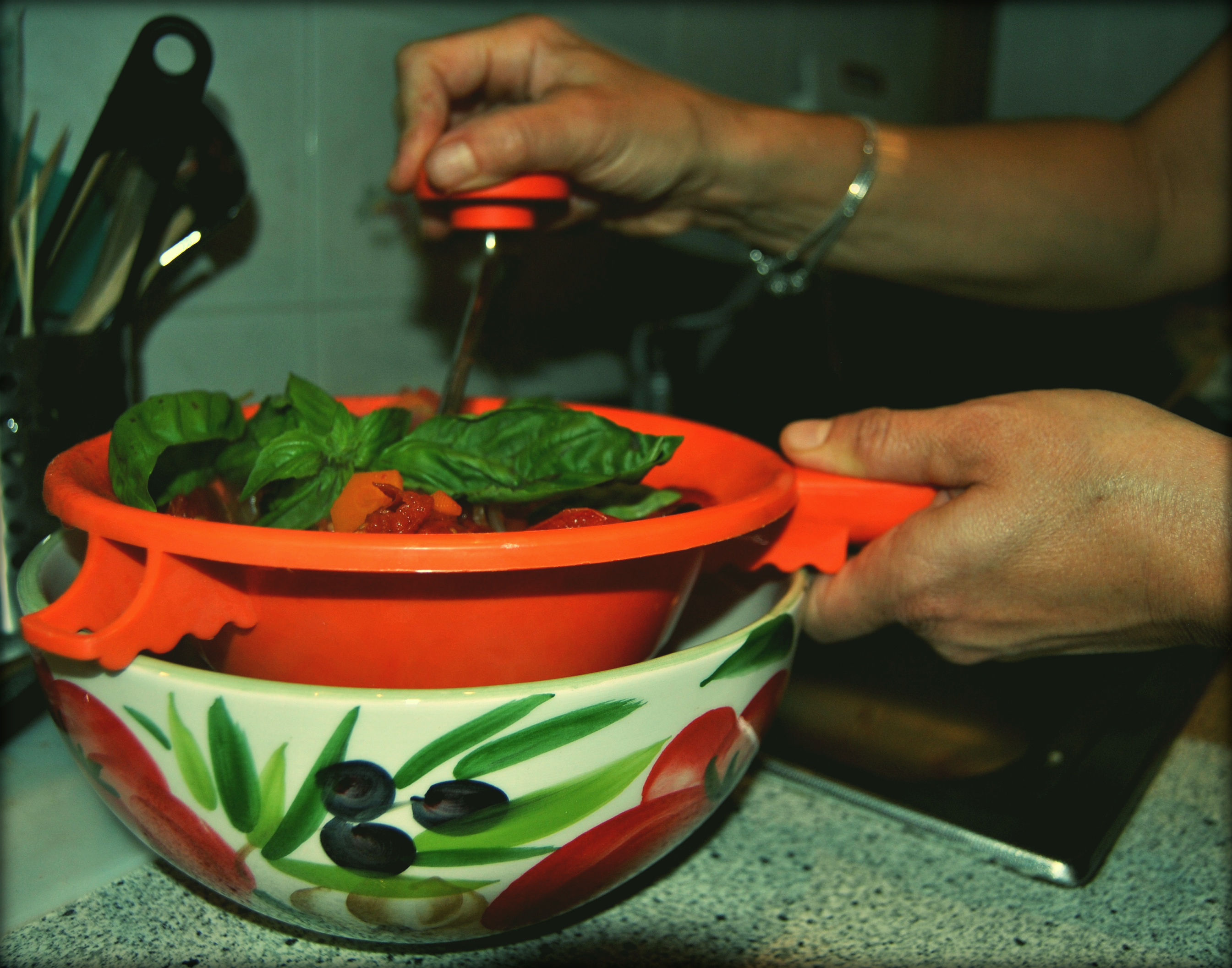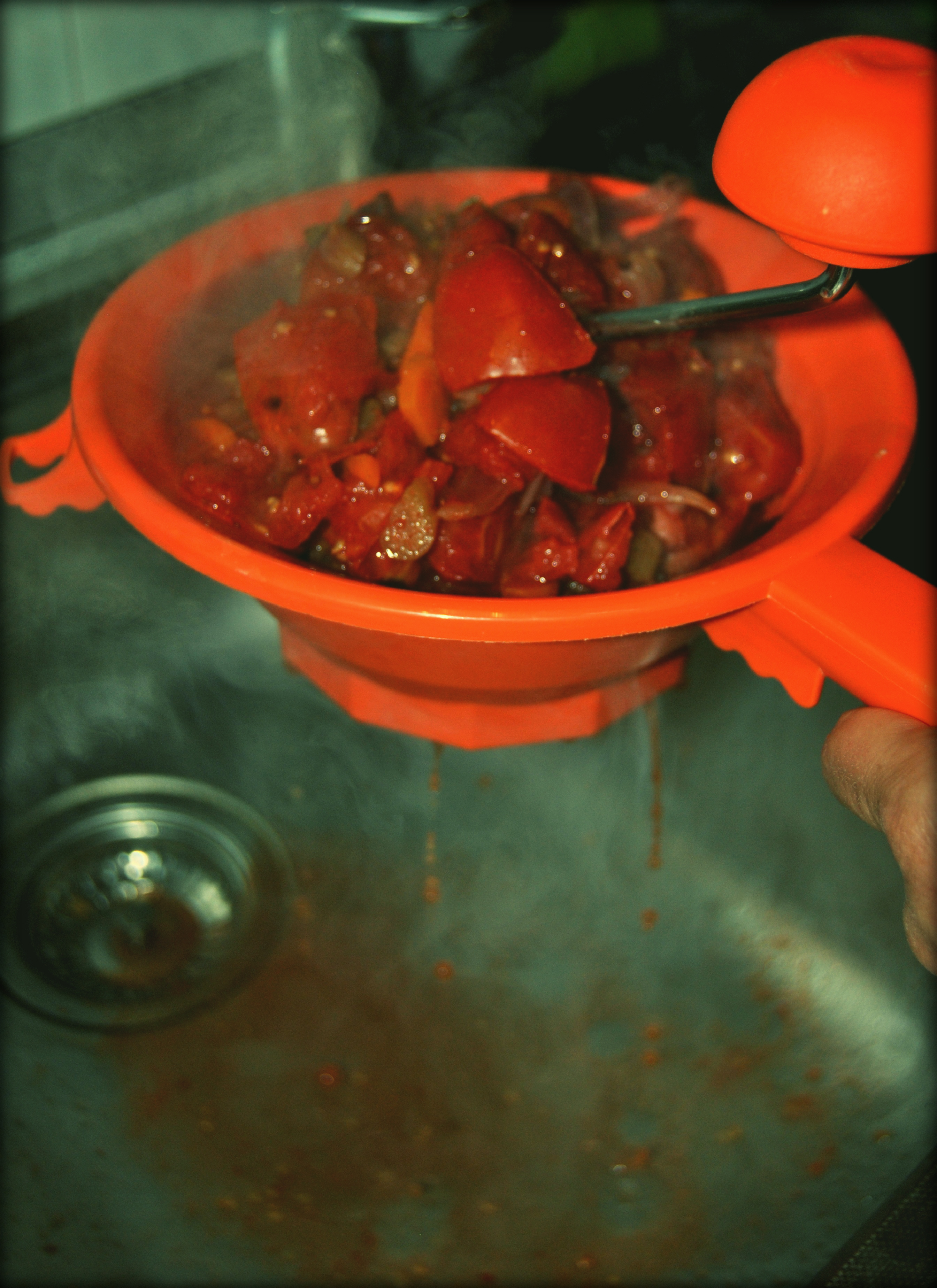7_A questo punto sono necessarie: una terrina, il passaverdure e un mestolo. L’ideale sarebbe utilizzare il classico “passa pomodoro” che separa la polpa dalle bucce, ma per quantità moderate come nel nostro caso, utilizzeremo il passaverdure.