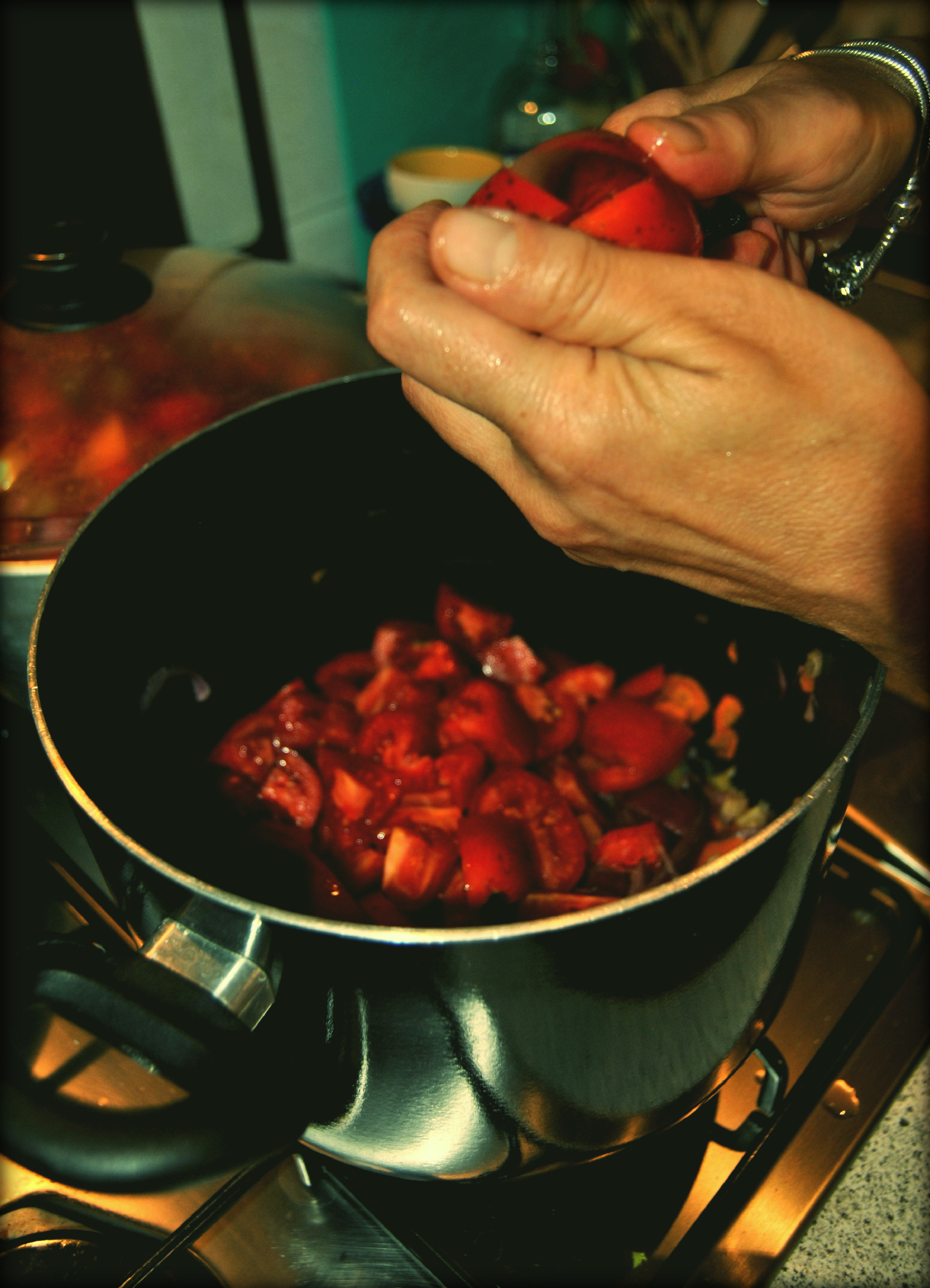 5_Tagliate i pomodori e aggiungeteli agli “odori” cotti precedentemente.