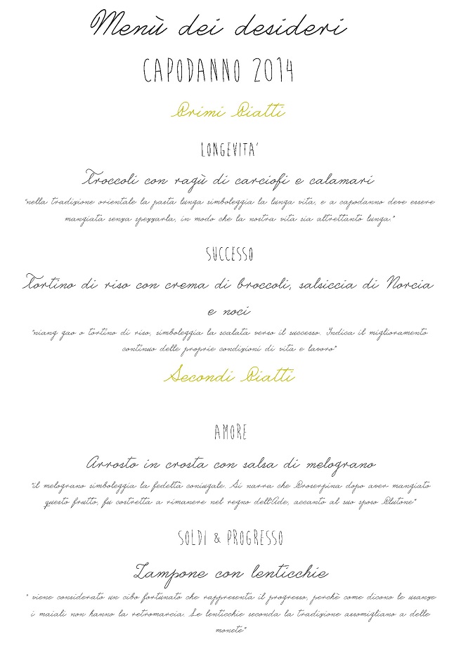 Durante il Cenone dei desideri abbiamo mangiato e brindato per l’amore, la fortuna, la prosperità, il lavoro, l’amicizia, la famiglia, la salute e la felicità. Insomma a tutto ciò che occorre, per un fantastico 2014!