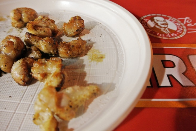 Ma prima la nostra attenzione è stata rapita da un ombrellone rosso e da una pentola di olio bollente, che faceva odorare la piazza di fritto. Come resistere?