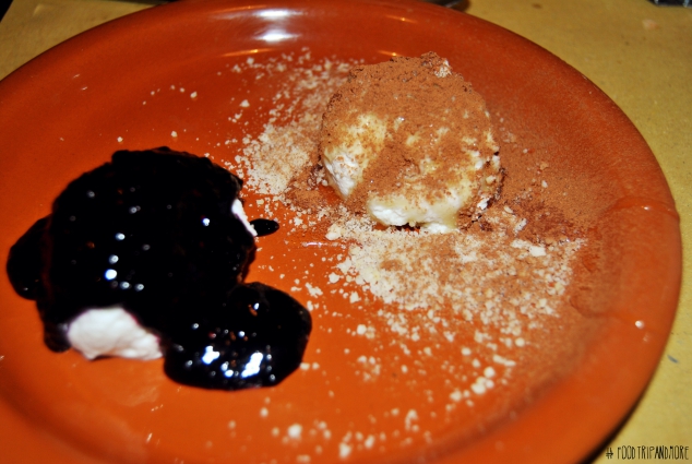 Per finire con palline di ricotta, una ricoperta di miele, cannella e polvere di mandorle, l’altra di marmellata di sambuco.