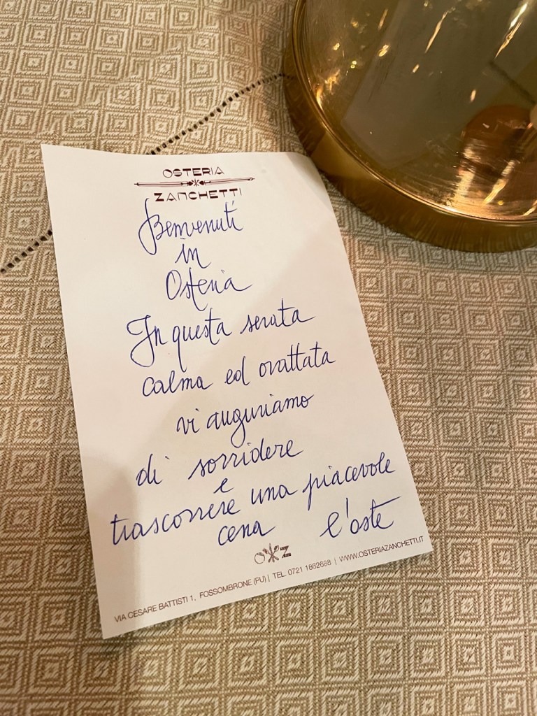 Se siete a Fossombrone non potete assolutamente non godervi un pranzo o una cena da Osteria Zanchetti. Vi sembrerà di entrare in una casa di un vostro amic* in un atmosfera calda e accogliente. Solo 16 coperti suddivisi su due piani e l’accoglienza unica dell’oste Luca Zanchetti.